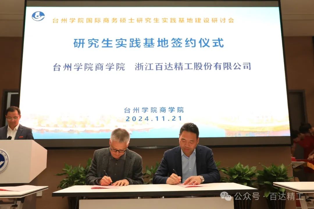 11月21日,公司总经理张启斌在台州学院出席了国际商务硕士研究生实践基地建设研讨会,并与台州学院商学院签订了“共建国际商务硕士研究生实践基地协议”。此次签约旨在为台州学院国际商务专业硕士研究生提供专业实践平台,同时满足我公司国际商务人才需求,打造高校与企业之间的人才绿色通道,强化高校与企业直接的产教融合,充分结合校方专业学科、人才培养优势和企业方产业集成优势,共同推进人才培养、项目合作与协同创新。